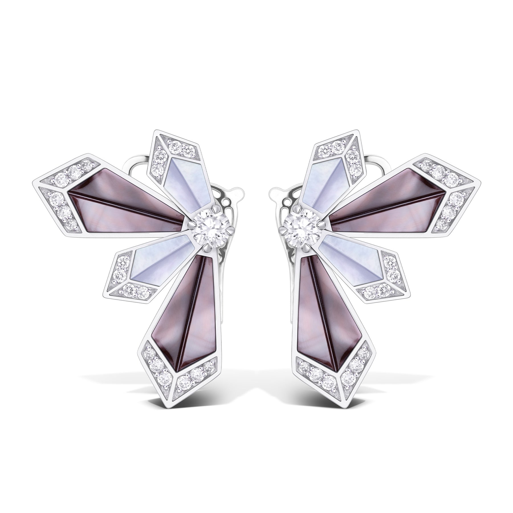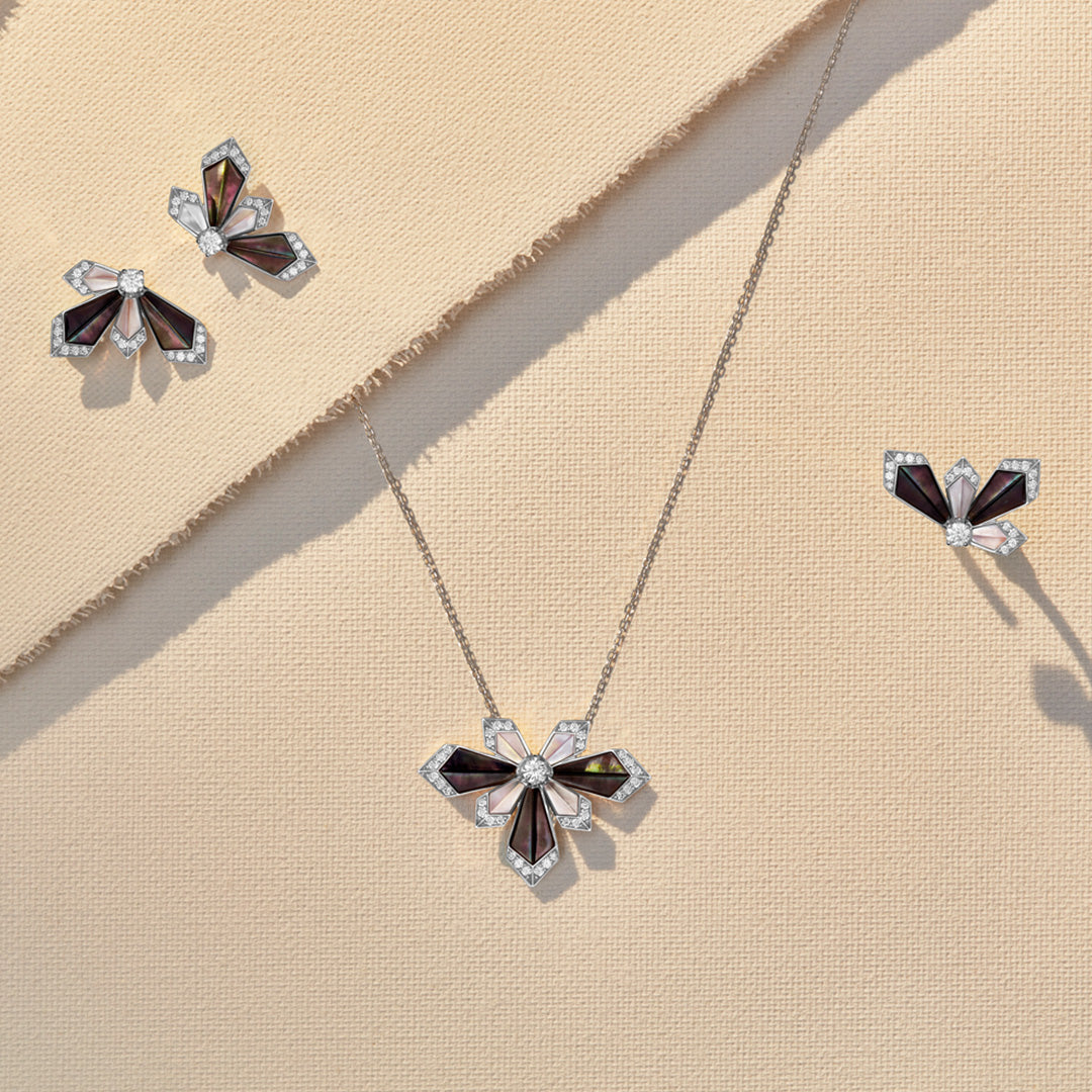 This stunning pair of Desert Rose Medium Earrings showcases a captivating blend of diamonds and black and white mother-of-pearl, set in white gold. Designed with a perfect balance of elegance and versatility, their medium size makes a bold statement for special occasions while remaining refined enough to complement casual or minimalist looks. Timeless pieces that effortlessly enhance any outfit with a touch of luxury.