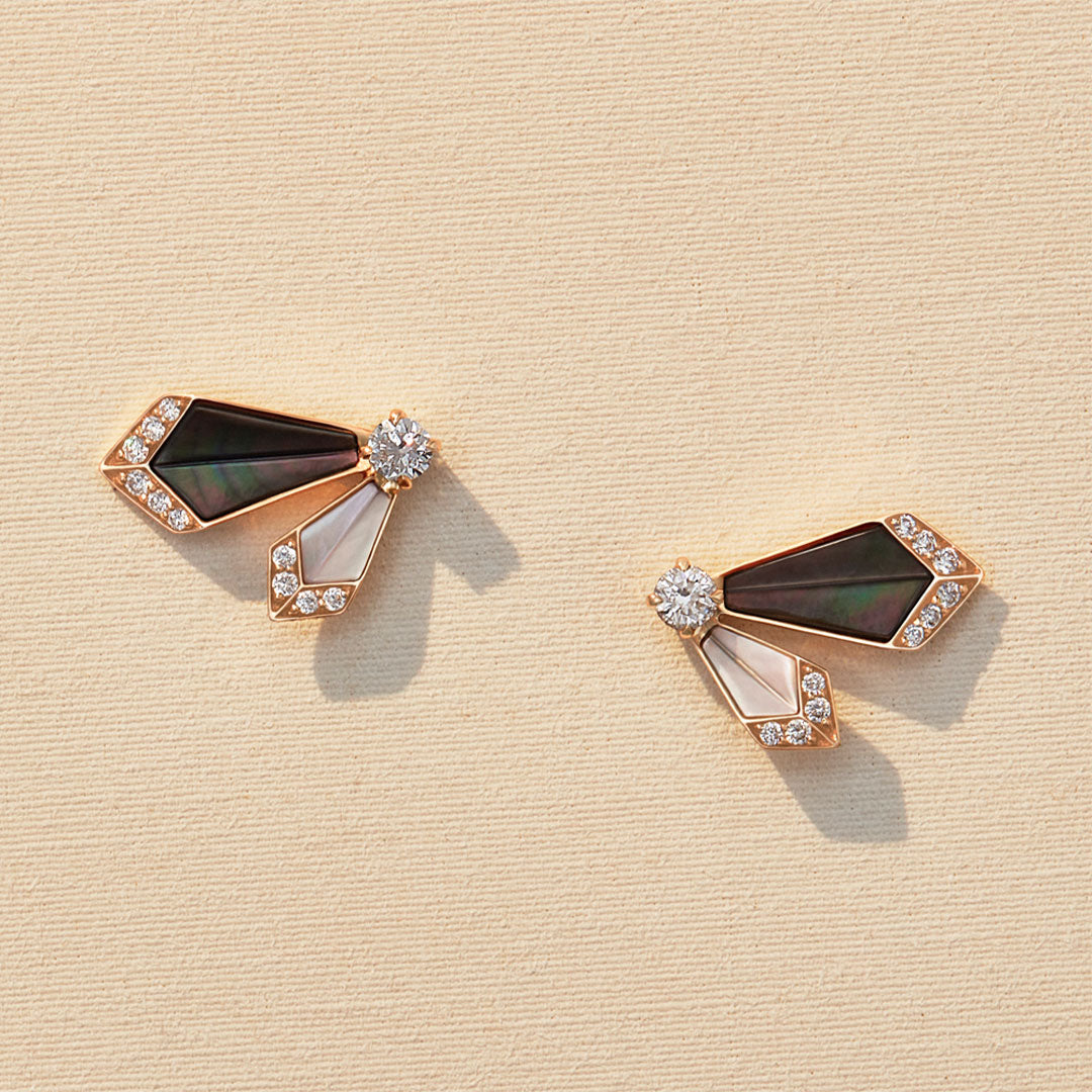 This stunning pair of Desert Rose Small Earrings features a unique and beautiful combination of diamonds, black and white mother-of-pearl, set in yellow gold. Delicately crafted, they exude elegance and sophistication. The perfect accessory for any occasion, they will surely make a statement and add a touch of luxury to any outfit..