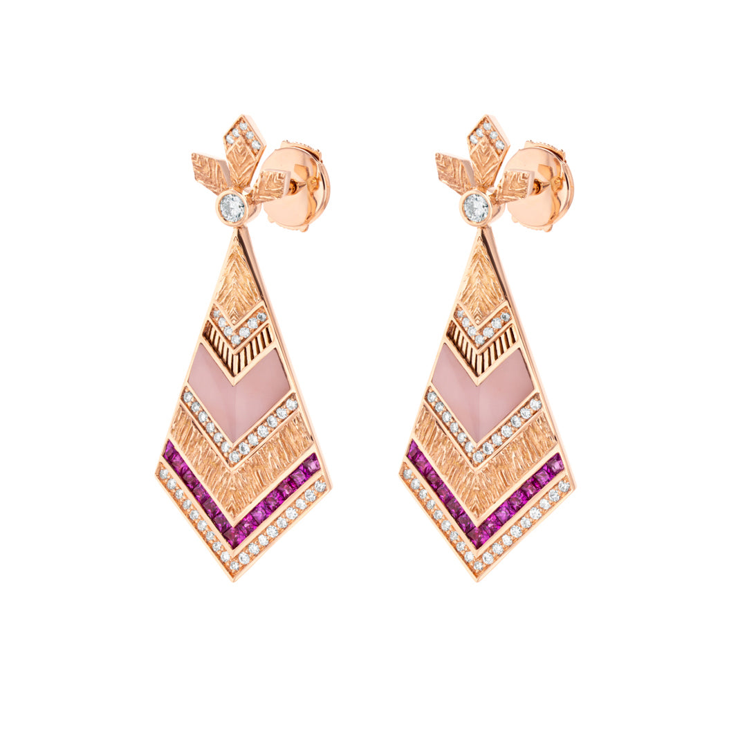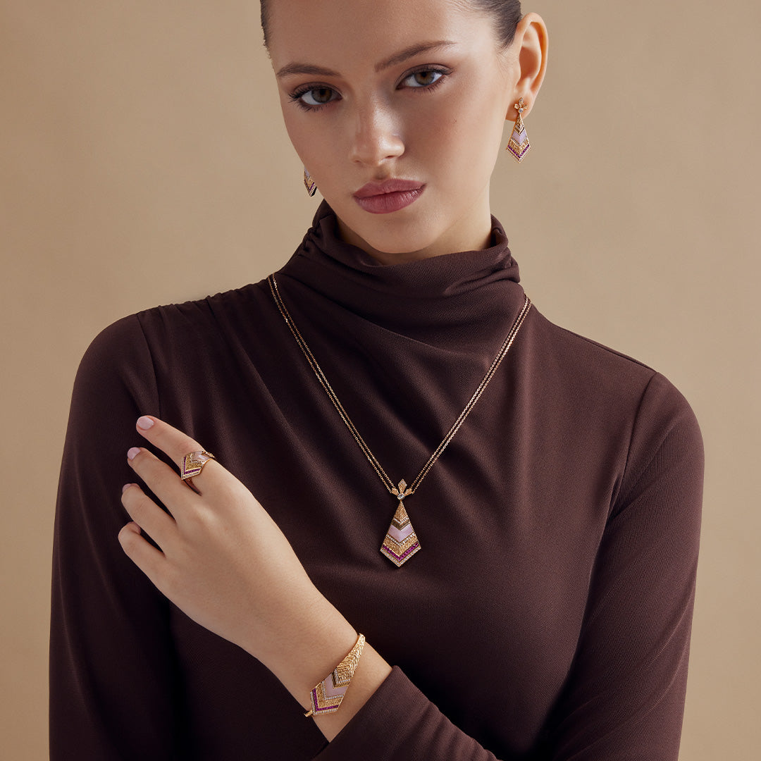 A statement piece of elegance, Golden Petals Earring is crafted with engraving-textured gold, princess-cut pink sapphires, round brilliant diamonds, and pink opal. Inspired by nature’s harmony, each design blends rich textures and vibrant stones to create a striking expression of luxury.
